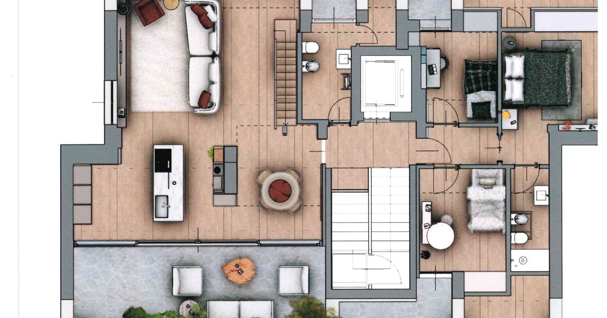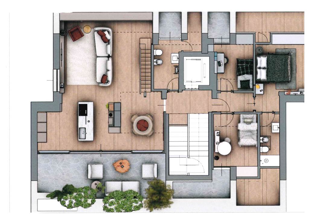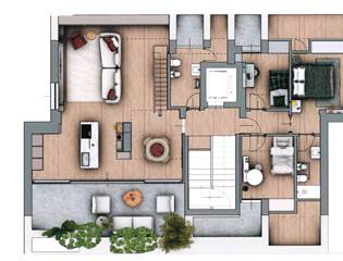L'attico dispone di una camera matrimoniale con bagno en suite finestrato e altre due camere, ognuna dotata di un terrazzino privato. Un secondo bagno con accesso ad un comodo terrazzino completa la distribuzione degli spazi, pensata per garantire il massimo della funzionalità. Inoltre, un locale sottotetto multiuso accessibile direttamente dall'appartamento tramite una scala di design di circa 45 mq. offre ulteriori possibilità di personalizzazione. Completa la proprietà la cantina e il box doppio di 33 mq, a un prezzo aggiuntivo complessivo di 50.000 euro.